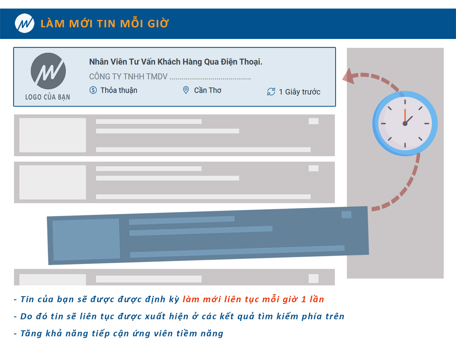Khi sử dụng gói làm mới tin này, tin tuyển dụng của bạn sẽ luôn được tự động làm mới mỗi giờ một lần liên tục (từ 7h - 18h). Giúp cho tin của bạn luôn hiện diện ở trang đầu, mà không bị trôi xuống các kết quả của các trang dưới khi ứng viên tìm kiếm việc làm trên website.