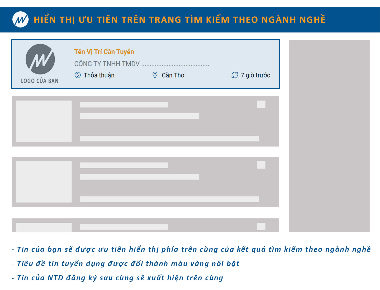 Tìm kiếm việc làm theo ngành nghề chuyên môn của mình luôn là ưu tiên hàng đầu của mọi ứng viên khi tìm việc, do đó nếu tin tuyển dụng của bạn luôn xuất hiện ở khu vực đầu tiên trên trang tìm kiếm theo ngành nghề sẽ có được hiệu quả tiếp cận ứng viên rất lớn.